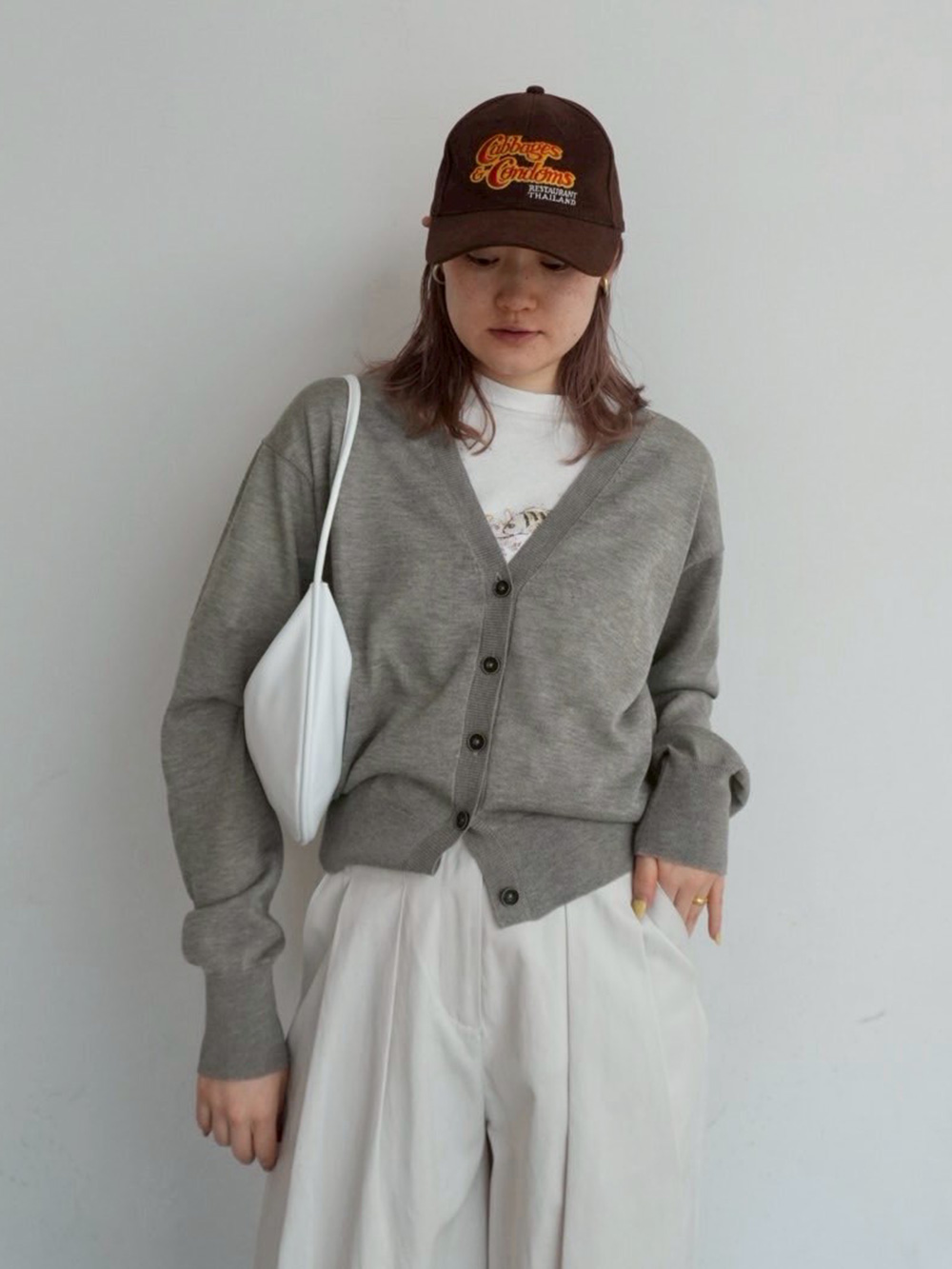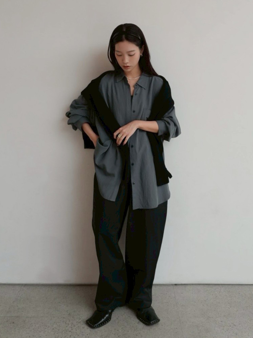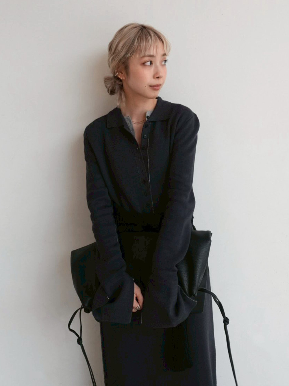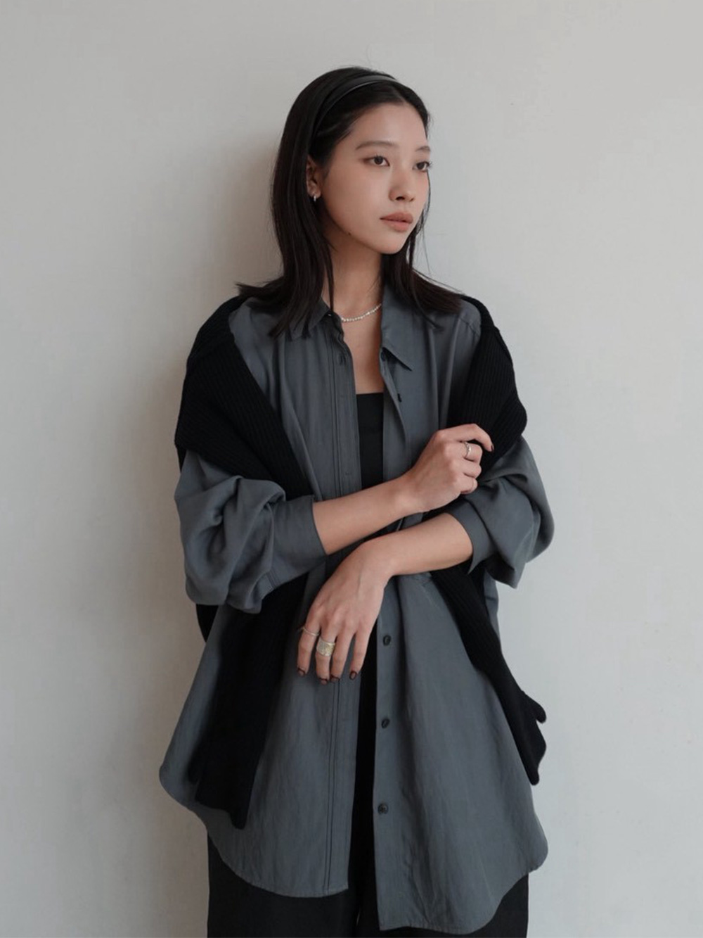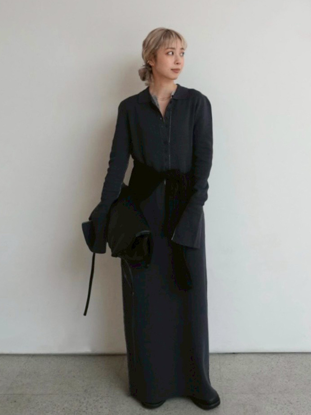 シンプルになりすぎないようニットを肩掛けし