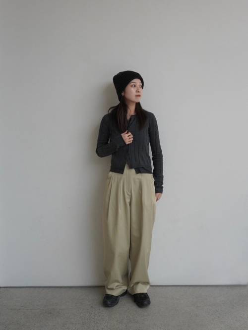 • コットン糸を使用した、カーディガンとノースリーブタンクトップのレイヤードニット。カーディガンは表情豊かなワイドリブ、タンクトップはフラットな編み地で仕上げ、編み組織のコントラストが洗練された奥行きを演出します。ロールエッジの仕様や、タンクトップの前立てに施したアウトリンキングなど、ミニマルな中に光る繊細なディテールも魅力。それぞれ単品でも様になります。程よい薄さと柔らかな風合いが心地よく、抜け感あるスタイリングを叶える一着。