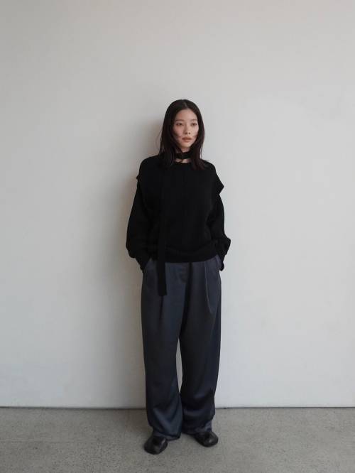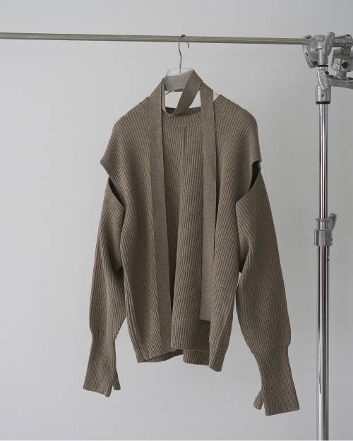 • 肉感のあるローゲージ編みで仕立てたデザインニット。アーム部分のスリットが着るだけでスタイリングに表情を添える一枚。スリットから腕を出して袖をフロントで結ぶことで、スリーブレスとしても楽しめる2WAY仕様。袖口のアームカバーデザインもポイント。付属のリボンタイをプラスすれば、モードで女性らしい印象にアレンジできる一着。シンプルながら、着こなしの幅と遊び心を叶えるニットトップスです。